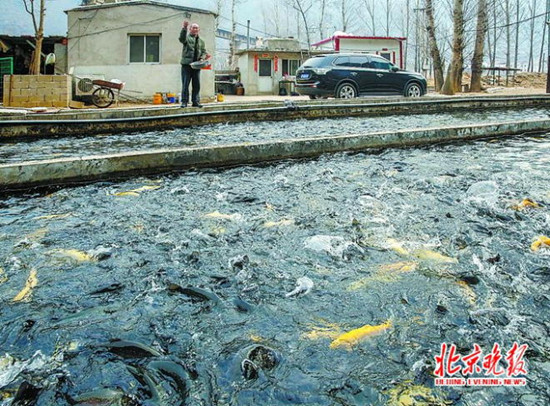 老董的鱼场位于山泉流向拒马河的必经之路,确保了水质、水温也能达到虹鳟等冷水鱼的要求
