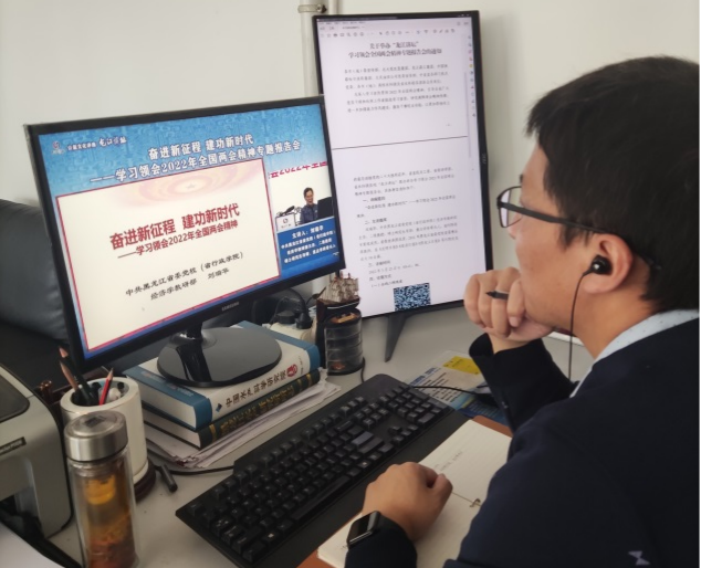 2022年3月25日渔业资源研究室党支部全体党员通过电脑或手机视频方式观看“龙江讲坛”集中学习领会全国两会精神专题报告会。