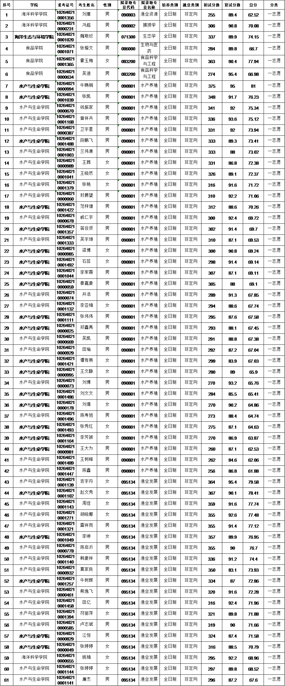 中国水产科学研究院与上海海洋大学联合培养硕士研究生拟录取(一志愿)名单公示