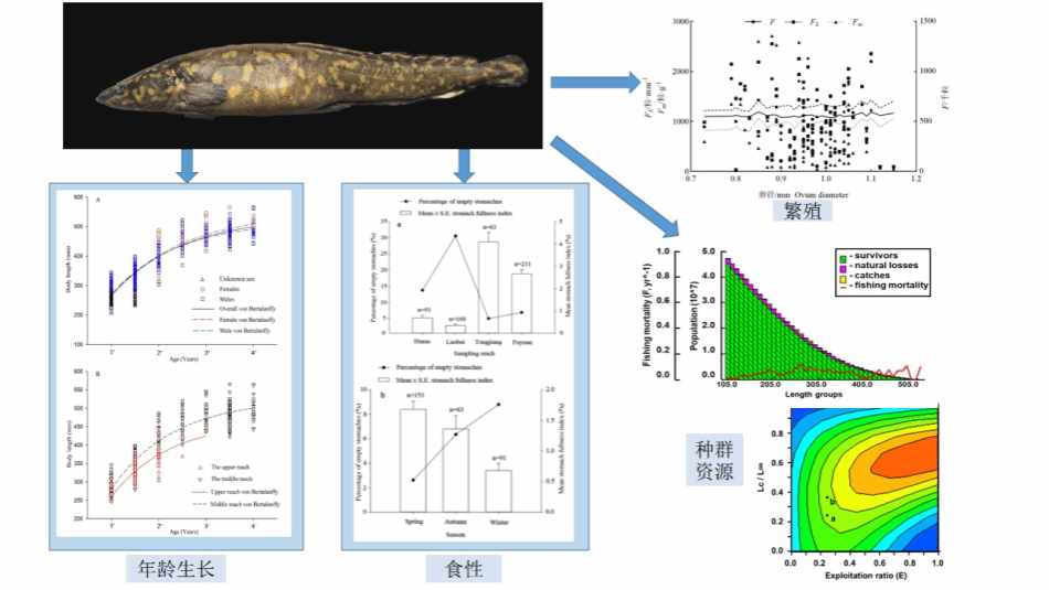 近三年,团队针对黑龙江流域江鳕开展了种群生物学特征和资源保护等系统性研究,揭示了江鳕年龄生长、摄食生态、繁殖机理、种群资源现状及变化规律。同时与俄罗斯联邦国家科学中心全俄渔业和海洋学研究所开展了密切合作,联合研究发现江鳕的寿命呈现随着纬度增高而增长的趋势。通过估算江鳕种群的开发率、年残存率、资源量及各阶段的存活概率等显示,目前黑龙江流域江鳕种群资源呈现恢复趋势。该研究为进一步开展江鳕的资源保护和开发利用提供基础数据和理论资料。
