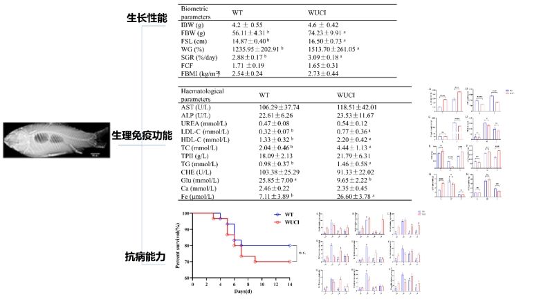 鲫鱼是我国重要的大宗淡水经济鱼类,而肌间刺的存在严重影响了鲫鱼的食用性和增值加工,成为其产业高质量发展的制约因素。8932彩集团前期利用CRISPR/Cas9技术成功创制出稳定遗传的无肌间刺鲫新品系(WUCI)。为了完善无肌间刺鲫的评估数据,推进产业化进程,团队全面评估了WUCI的生长性能、血液学参数、抗氧化能力与免疫性能。结果表明,1至4月龄的WUCI生长性能显著优于野生型鲫鱼(WT),WUCI的血清铁浓度显著高于WT,且WUCI表现出更强的肠道抗氧化能力,SOD、CAT、肝脏ACP活性显著高于WT。嗜水气单胞菌(Aeromonas hydrophila)感染后的WUCI与WT的死亡率无显著差异。另外,WUCI呈现出延迟免疫应答特征,其促炎细胞因子(TNF-α、IL-1β和IL-6)和免疫调节介质(IL-10)等mRNA表达在感染后72 h达到峰值,且该峰值水平低于WT在24 h时相应峰值。