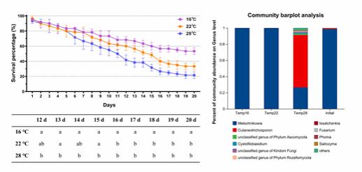 图2 养殖温度对感染蟹存活率及肝胰腺真菌菌群结构的影响