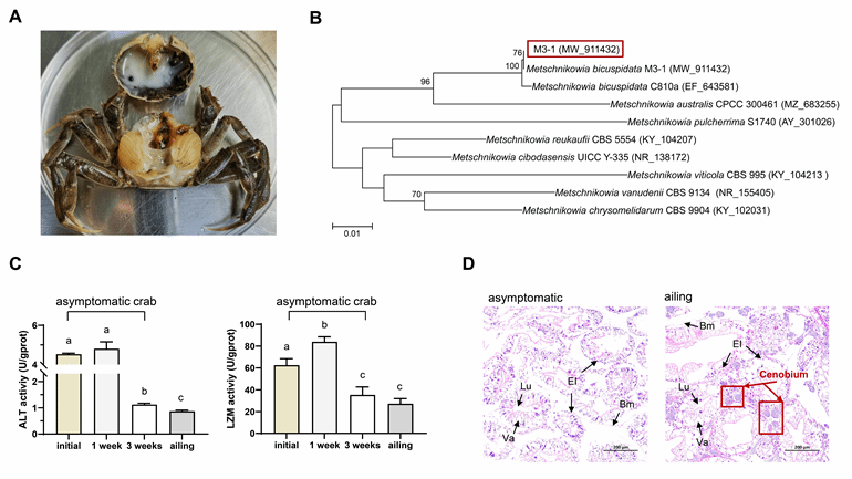 河蟹牛奶病是由 “二尖梅奇酵母” 真菌感染引发的养殖疾病,具有高传染率、高死亡率的特点。自 2018 年在辽宁盘锦首次发现以来,东北地区河蟹养殖中的牛奶病连年频发,给养殖户造成极大经济损失,严重制约了东北河蟹养殖产业的可持续发展。环境因子是影响病原体与宿主平衡共存关系的重要因素,对疾病防控具有重要作用。该团队通过监测不同养殖条件下受病原感染河蟹的存活率,结合肝胰腺组织切片观察、生理生化指标检测及细菌与真菌微生物多样性分析等技术手段,探究了温度、pH 值、碱度等环境因子对河蟹牛奶病防控的影响及相关机制。
