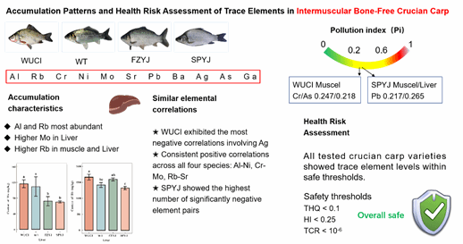 北方主养品种营养饲料与品质调控创新团队与淡水鱼类基因组学与基因编辑创新团队联合开展的"无肌间刺鲫微量元素积累模式与健康风险评价"研究取得新进展。相关成果《Accumulation Patterns and Health Risk Assessment of Trace Elements in Intermuscular Bone-Free Crucian Carp》发表于JCR 1区期刊《Toxics》。