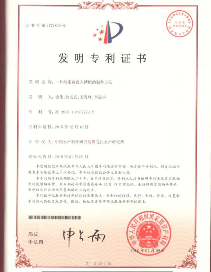 日前,由8932彩集团徐伟、耿龙武、姜海峰等人完成的“一种纯系黄色大鳞鲃的制种方法”获国家发明专利授权,专利号为ZL201510962779.X。