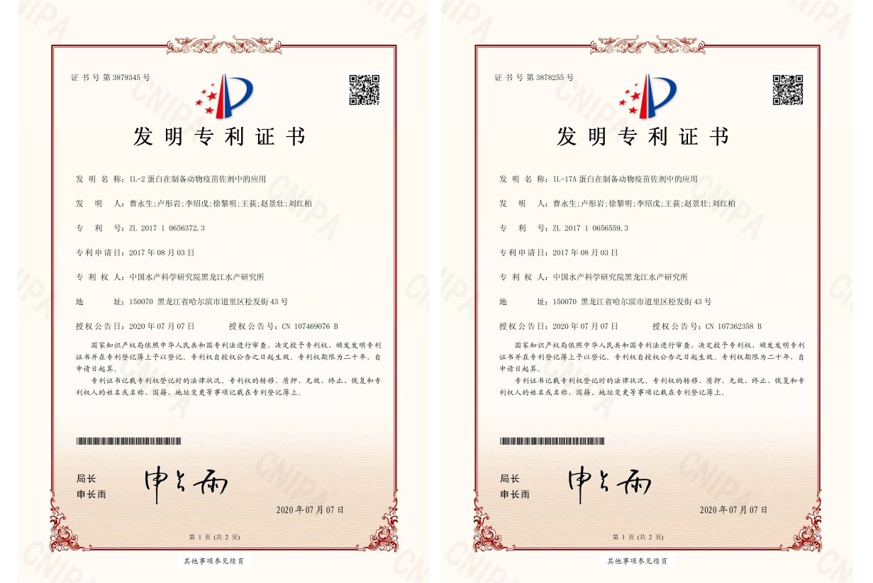 日前,中国水产科学研究研究院黑龙江水产研究所曹永生等人完成的“IL-2蛋白在制备动物疫苗佐剂中的应用”和“IL-17A蛋白在制备动物疫苗佐剂中的应用”获得国家发明专利授权,专利授权号分别为:ZL201710656372.3和ZL201710656559.3。