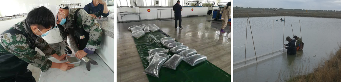 盐碱水域养殖品种开发与利用科技创新团队承担本课题的3项主要任务,一是“东北盐碱水域特色鱼类池塘生态养殖模式示范与推广”任务,本年度在青花湖黑龙江北鱼渔业集团有限公司建立示范基地,繁育并投放150g大鳞鲃鱼种2000余尾、夏花20万尾、水花60万尾、雅罗鱼夏花6万尾,示范推广面积500亩,在佳木斯郊区水产技术推广站养殖基地投放大鳞鲃夏花10万尾,示范面积150亩;二是“盐碱湿地苇塘河蟹生态养殖模式构建与示范”任务,本年度在黑龙江省肇源县鲶鱼沟实业集团有限公司建立示范基地,先后投放扣蟹苗种1000余万只,示范面积5万亩;三是““双效降碱”循环水渔农异位生态种养技术集成与示范”任务,本年度在黑龙江省肇源县鲶鱼沟实业集团有限公司和黑龙江省大庆市连环湖渔业有限公司示范基地共计投放150g大鳞鲃鱼种3万余尾,综合示范面积170亩。