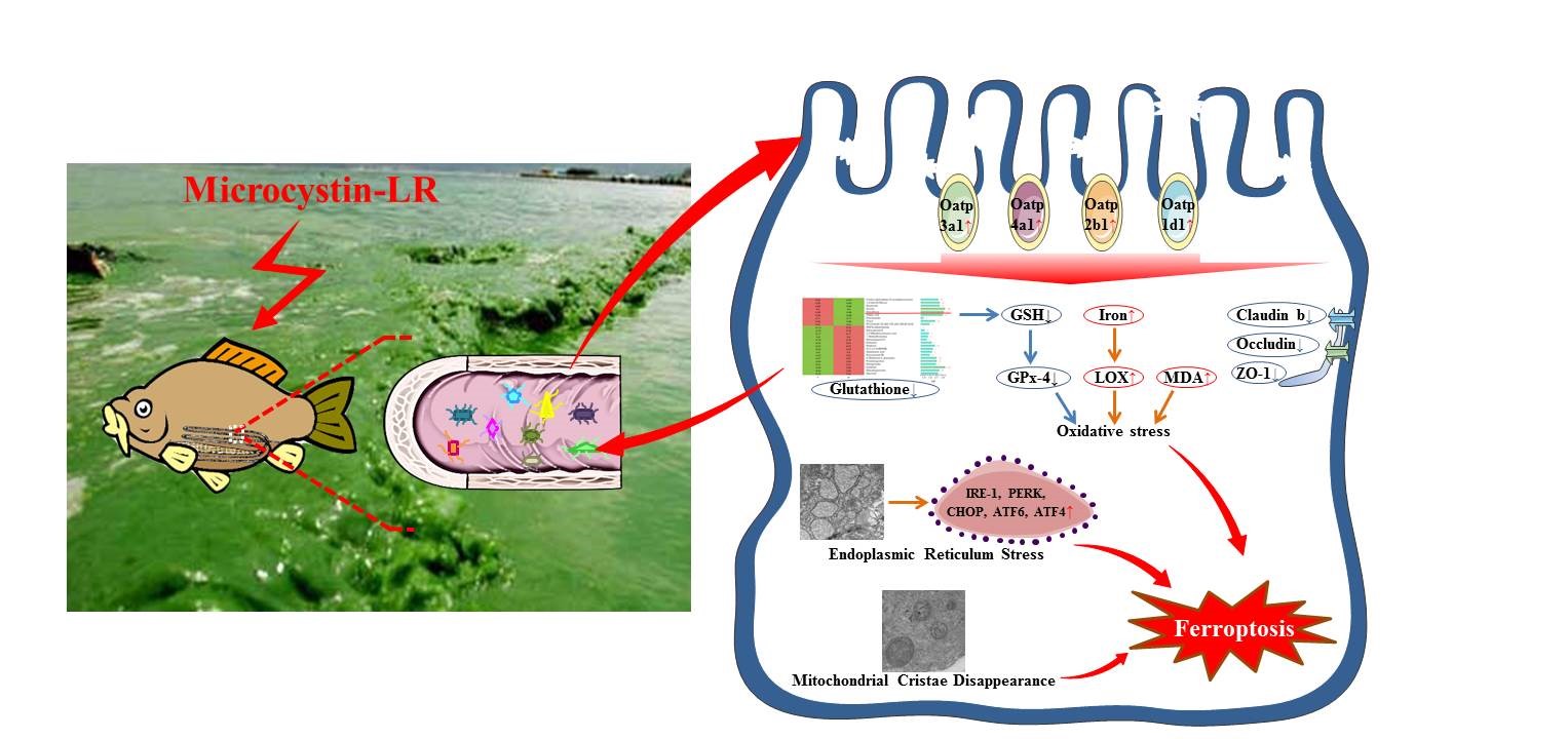 本研究首次揭示了微囊藻毒素诱发鲤鱼肠道铁死亡的现象,为微囊藻毒素毒性作用机制的阐释以及微囊藻毒素致病的治疗靶点的发掘奠定基础。