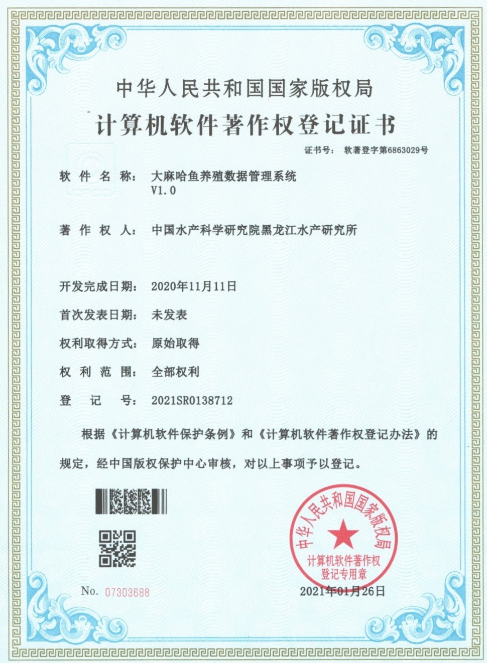由寒地水域渔业资源调查与评估团队李培伦申请的“大麻哈鱼养殖数据管理系统V1.0”获国家计算机软件著作权,登记号:2021SR0138712。该系统为大数据软件,采用最先进的设计方法,可以让用户无需培训即可操作,具有简便快捷的优点,方便用户进行日常养殖数据的管理记录工作。该系统面向需要进行大麻哈鱼养殖记录管理的用户,登陆页面后,可直观看到多个个性化功能模块,轻松记录及翻看之前的数据,并对数据进行归纳分析,实时掌握养殖情况。