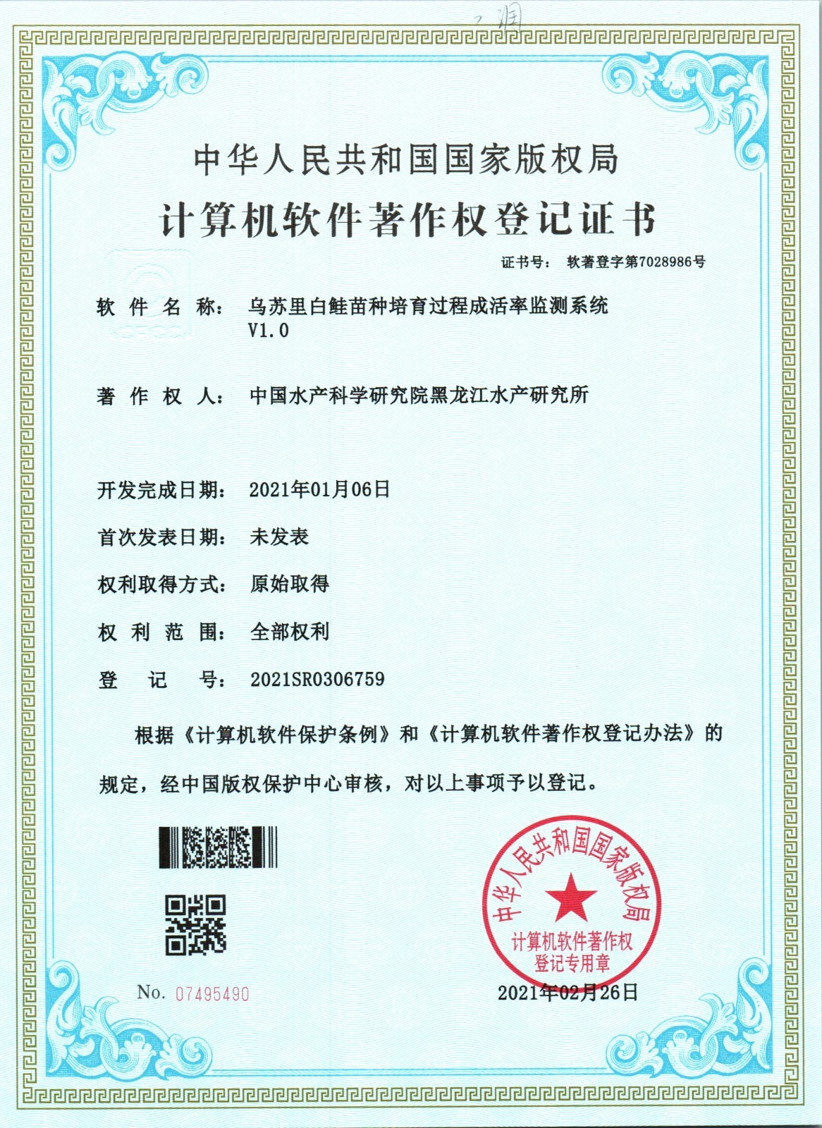 日前,由鲑鳟遗传育种科技创新团队徐革锋研究员等人申请的“乌苏里白鲑苗种培育过程成活率检测系统V1.0”获得国家计算机软件著作权,登记号为2021SR0306759。