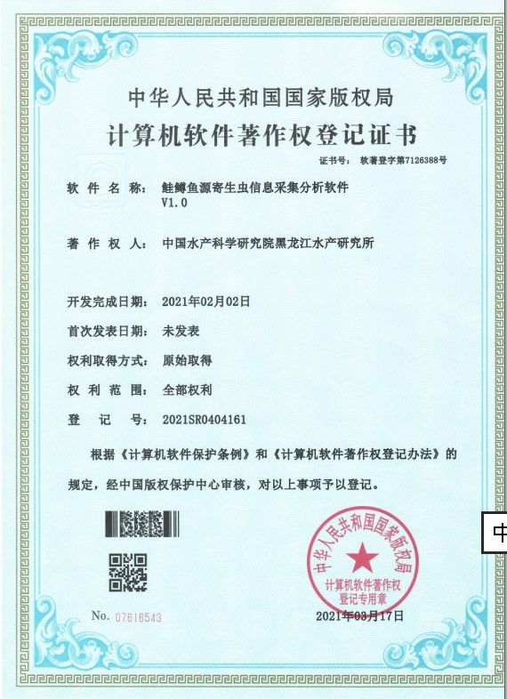 日前,由冷水性鱼类病害防控科技创新团队王荻等人申请的“鲑鳟鱼源寄生虫信息采集分析软件V1.0”获国家计算机软件著作权,登记号为2021SR0404161。