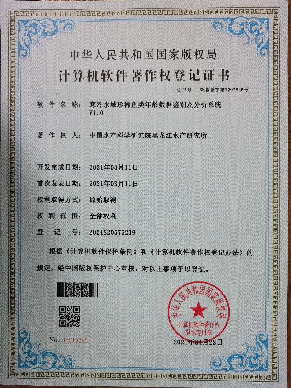 由寒地水域渔业资源调查与评估科技创新团队申请的“寒冷水域珍稀鱼类年龄数据鉴别及分析系统V1.0”获国家计算机软件著作权,登记号为2021SR0575219。