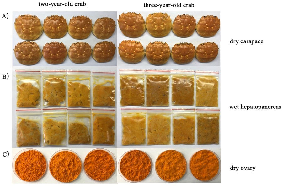 中华绒螯蟹是我国重要的特色水产经济动物,在南方地区通常2年养成性成熟的大规格商品蟹,而在东北地区,受气候影响,养殖的2龄蟹虽然性成熟,但规格较小。本团队在黑龙江省绥化市池塘养殖2龄的中华绒螯蟹中发现部分未成熟个体,继续养成3龄性成熟的大规格商品蟹。在此基础上,本团队比较了3龄和2龄性成熟大规格商品蟹的可食率、色泽、常规生化组成、脂肪酸、游离氨基酸和矿物质元素等品质参数。结果显示,同一时期3龄蟹的性腺指数(GSI)显著高于2龄蟹,且其可食组织(肝胰腺、性腺和肌肉)中DHA, ARA, PUFA, ΣEFA, ΣHUFA, Σn-6 PUFA和DHA/EPA均高于2龄蟹;3龄蟹除Zn元素外,其余测定的矿物质元素(Na、K、Ca、Mg、Fe、Cu、Mn和Se)均高于2龄蟹。