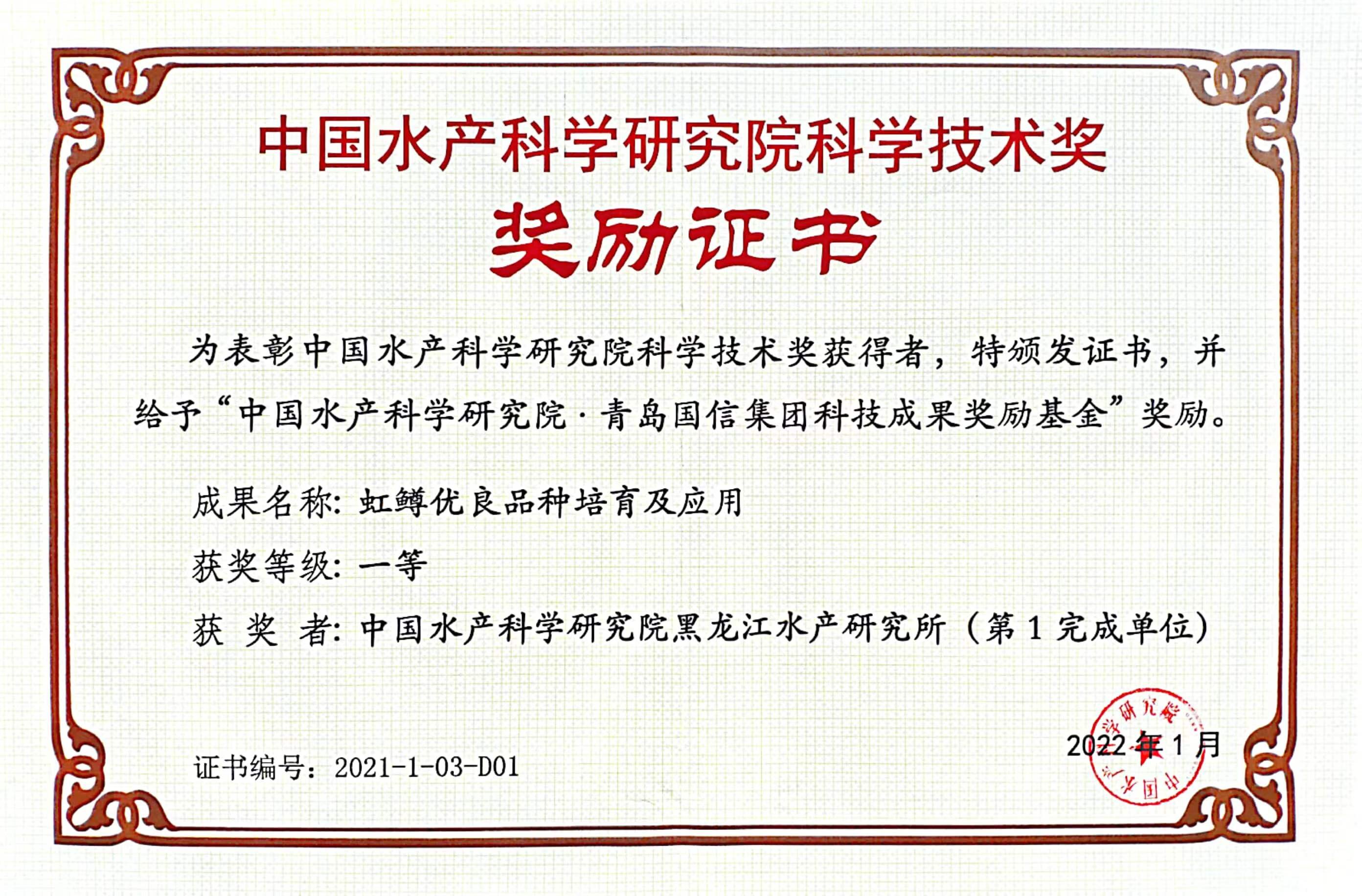 该研究成果“虹鳟优良品种培育及应用”获得2021年度中国水产科学研究院科学技术一等奖。