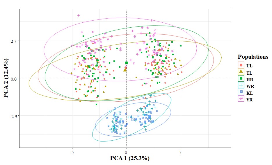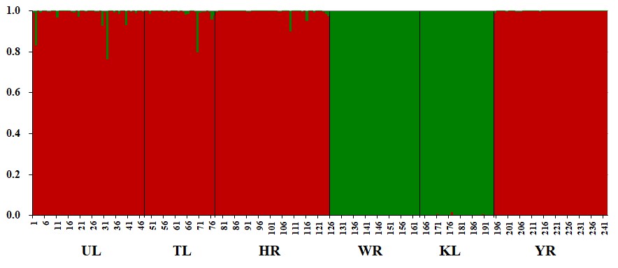 8932彩集团生物技术团队陆续收集了新疆乌伦古湖(UL)、宁夏腾格里湖(TL)、黑龙江黑河段(HR)、乌苏里江抚远段(WR)、兴凯湖(KL)和鸭绿江丹东段(YR)的6个梭鲈群体样本,开展了群体遗传学研究。基于梭鲈基因组序列,开发和筛选了30个微卫星序列,评估了6个群体的遗传结构和遗传分化。结果显示UL、TL、HR、YR梭鲈群体处于高度多态水平(PIC≥0.5),而WR和KL群体处于中度多态水平(0.25≤PIC<0.5)。梭鲈群体间具有中度遗传分化(FST=0.2093>0.15),而UL、TL、HR、YR 4个梭鲈群体与KL、WR群体具有高度的遗传分化。