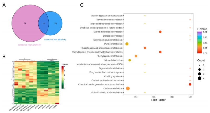 盐碱对水产动物的毒性作用是制约盐碱水养殖的重要因素。该研究聚焦碳酸盐型盐碱池塘养殖的重要经济蟹类——中华绒螯蟹,从代谢组学、免疫反应、抗氧化能力、组织生理等层面探究了中华绒螯蟹对水体碳酸盐碱度的响应机制。研究表明,中华绒螯蟹主要通过“花生四烯酸代谢”响应途径应对碱胁迫。同时,低碱度可促使中华绒螯蟹调动机体能量储备,抑制蛋白质和氨基酸分解代谢,刺激其启动抗炎和排泄调控以防御碱胁迫;而高碱度对中华绒螯蟹的生理代谢、免疫调控、组织结构均可产生不同程度的破坏作用。该研究对中华绒螯蟹的盐碱水养殖具有重要的指导意义。
