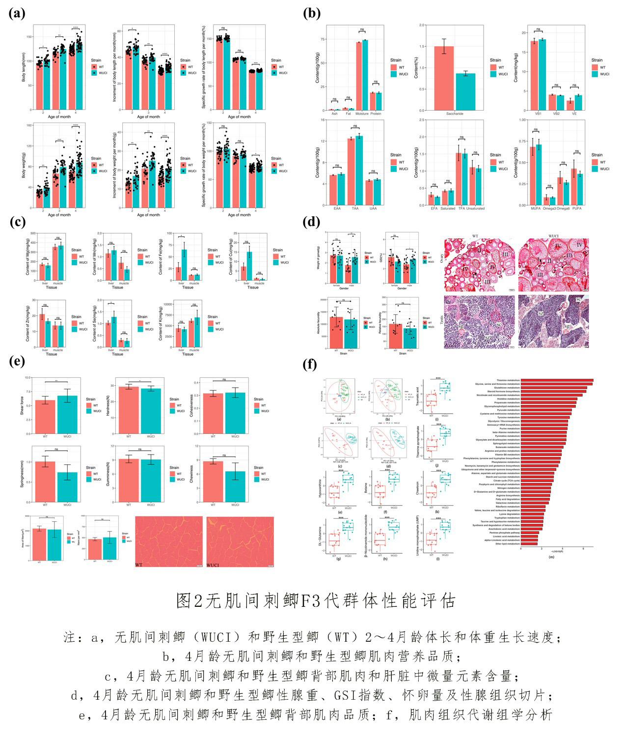 该研究还比较分析了无肌间刺鲫第三代群体与野生型鲫在生长、繁殖、肌肉品质等特征的差异。结果显示,第三代群体在4月龄时生长速度优于野生型二倍体鲫,其繁殖性能、肌肉营养成分、肌肉质地结构与野生型鲫无显著差异。代谢组学分析表明,第三代群体肌肉组织中富集多种对人体有益的代谢物,如β-烟酰胺单核苷酸等。