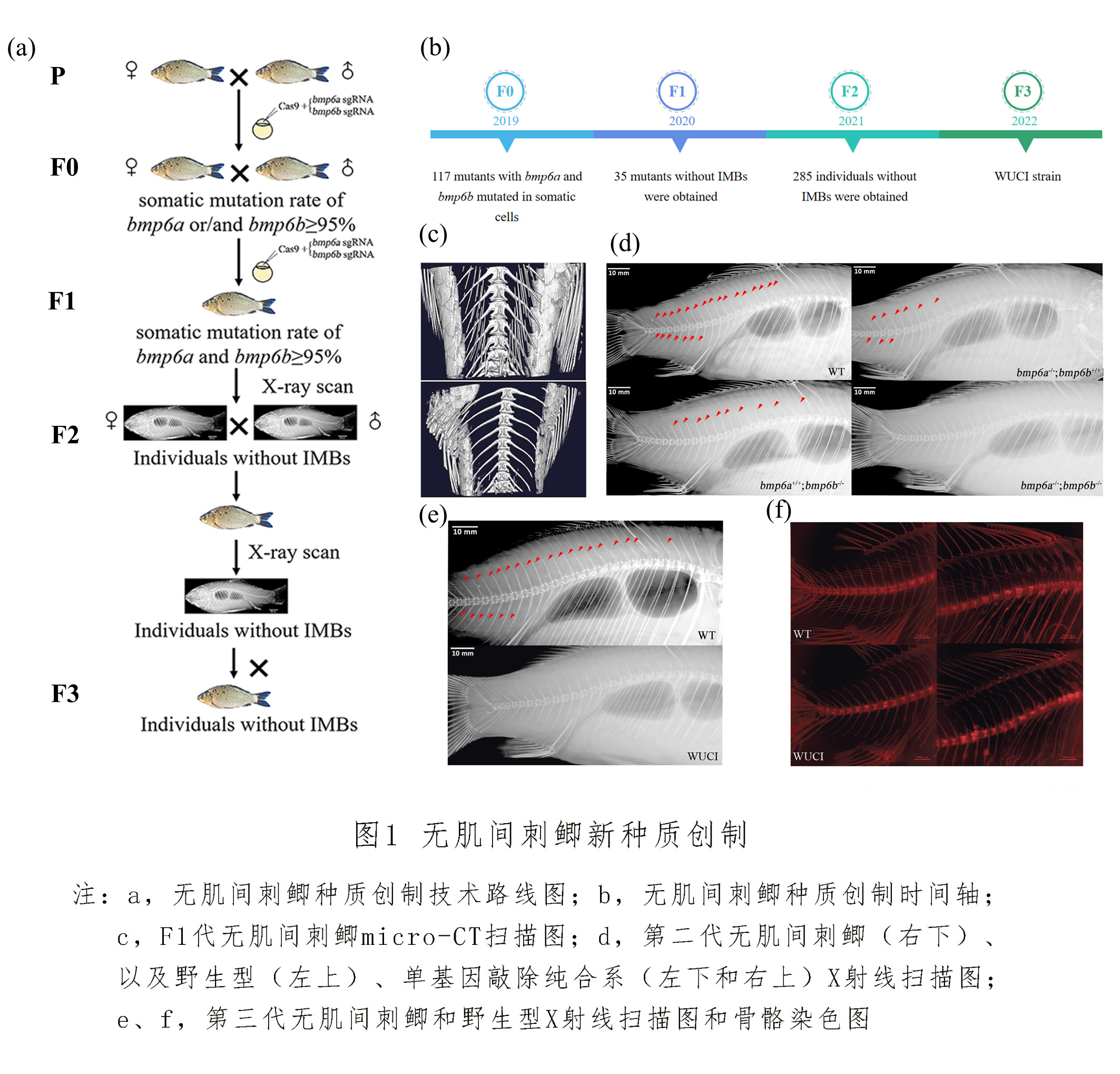 自2009年起,团队从解析肌间刺形成和发育的遗传机制入手,通过基因组尺度关联分析和多组学手段,鉴定到调控肌间刺发育的关键基因bmp6,并揭示出bmp6基因调控肌间刺形成的分子机制。根据鲫经历过第4轮基因组复制的特征,设计了一种多基因敲除快速创制新种质的策略,极大地缩短了多基因敲除纯合系构建的周期。通过同时敲除鲫基因组的bmp6abmp6b,于2020年获得35尾F1代无肌间刺突变体,在此基础上,2022年培育出无肌间刺第三代群体2万余尾,无刺比例100%,首次证实了鱼类无肌间刺性状可稳定遗传。