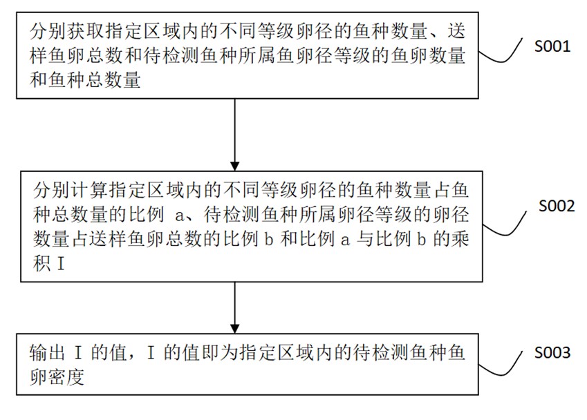 本发明属于鱼类调查技术领域,具体涉及一种统计指定区域内的鱼卵密度的方法及装置。该方法能够利用有限的检测力量,最大限度的将鱼卵样品种类鉴定出来,能够起到了样本量少,样品检出率高的效果,可以将鱼卵的种类鉴定和鱼卵的密度准确统计计算。
