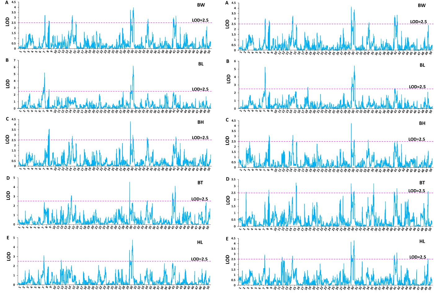 利用11,445个高质量SNP标记构建了一个包含50个连锁群的高密度遗传连锁图谱,围绕第一个越冬期,共鉴定出15个对越冬前后体重有显著影响的QTLs,鉴定到2个主效QTL,还发现多个位点在2个时间点影响体重之外的其他4个性状,包括体长(6个位点)、体高(7个位点)、体厚(3个位点)和头长(5个位点)。此外,在QTL区间还鉴定了9个候选基因,有5个基因直接与生长激素相关,其中3个基因来自2个主效QTLs。该研究鉴定的第一个越冬期前后的生长相关的QTLs及候选基因,可对东北或其他高纬地区鲤生长性状的早期选择提供参考。