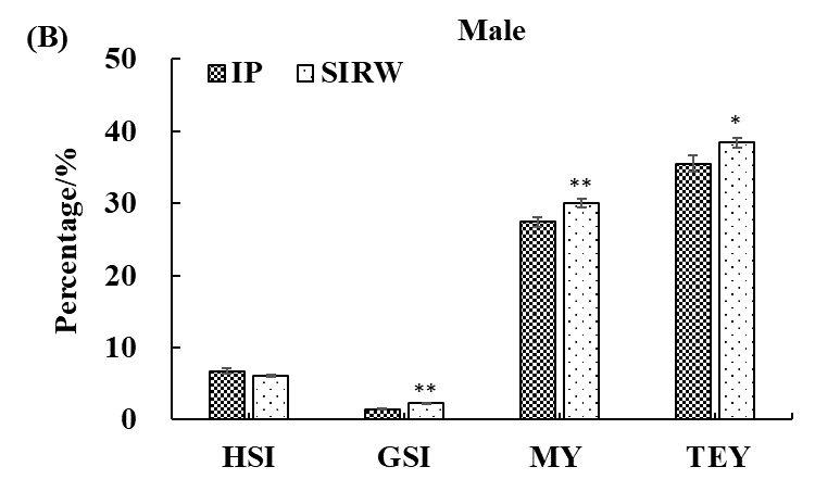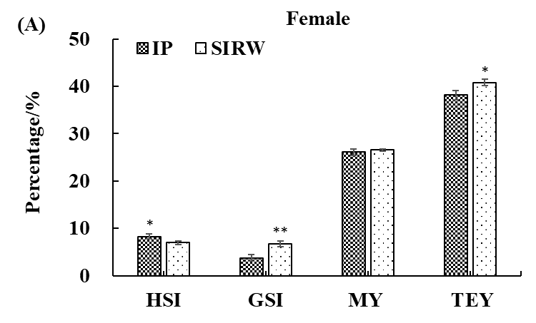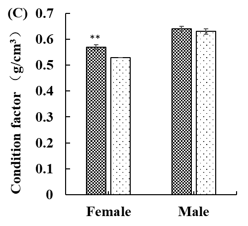 中华绒螯蟹(俗称:河蟹)是我国重要的水产经济动物,近5年黑龙江省等寒冷地区的养殖面积和产量逐年提高,成为促进农民增收、推动乡村振兴的重要产业。前期研究发现,盐碱水域养殖河蟹的风味更加,为探究寒地盐碱水养殖河蟹与淡水养殖河蟹的品质差异,本研究以寒地盐碱水池塘(盐度:0.68±0.05 ppt;碳酸盐碱度:8.48 ± 0.32 mmol/L;pH 8.72 ± 0.04)和苇塘(盐度:0.56±0.02 ppt;碳酸盐碱度:8.88 ± 0.04 mmol/L;pH 8.65 ± 0.04)养殖的辽河水系河蟹为研究对象,分析性腺发育、总可食率、常规营养成分、脂肪酸、游离氨基酸和矿物质元素等指标,结果表明寒地盐碱水池塘养殖雌性河蟹积累更多的总单不饱和脂肪酸(∑MUFA)和总必需游离氨基酸(∑EFA),同时其卵巢中积累更多的如钾K、钙Ca、镁Mg、铁Fe和锌Zn等矿物质元素。苇塘养殖中华绒螯蟹肌肉中则积累更高的总游离氨基酸(∑FAA)。寒地盐碱水养殖的辽河水系河蟹能够完成性腺发育过程,同时积累更多的类胡萝卜素、脂肪酸、游离氨基酸和矿物质元素。该研究证实了盐碱水可显著提升养殖河蟹品质的猜想。