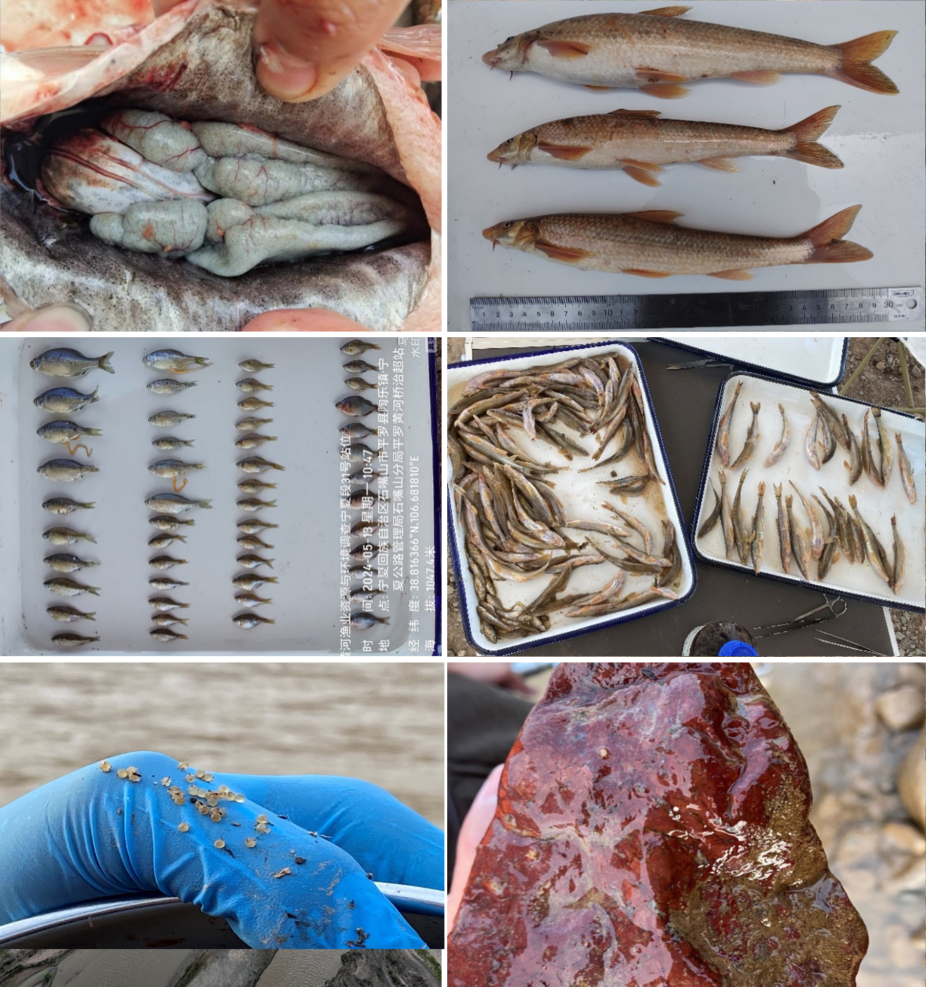 本次调查工作对黄河干流龙羊峡至石嘴山段33个渔业资源与环境站点进行了系统监测。主要调查内容为:鱼类种类组成、种群及生物学特征、珍稀濒危鱼类、鱼类关键栖息地、饵料生物、水体理化环境、渔业保护管理现状以及渔业受威胁因素等。其中,鱼类样品采用定置刺网、流刺网、地笼等网具采集。共采集鱼类11200尾,总重量211.58kg,分属5目12科37属50种。保存鱼类标本约200尾,采集鳍条、耳石、胃肠道、鱼卵、环境DNA等样品1800余份,用于遗传多样性、年龄鉴定、食性及关键栖息地等方面的分析。同时采集浮游植物、浮游动物、底栖动物、着生藻类等饵料生物样品以及水、底泥等环境样品。