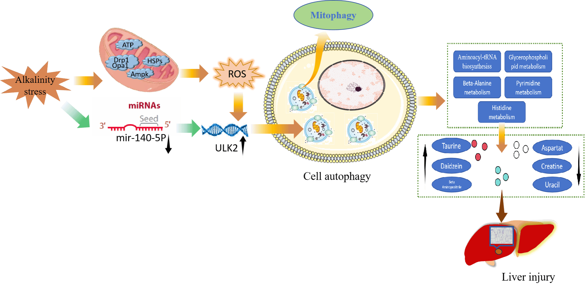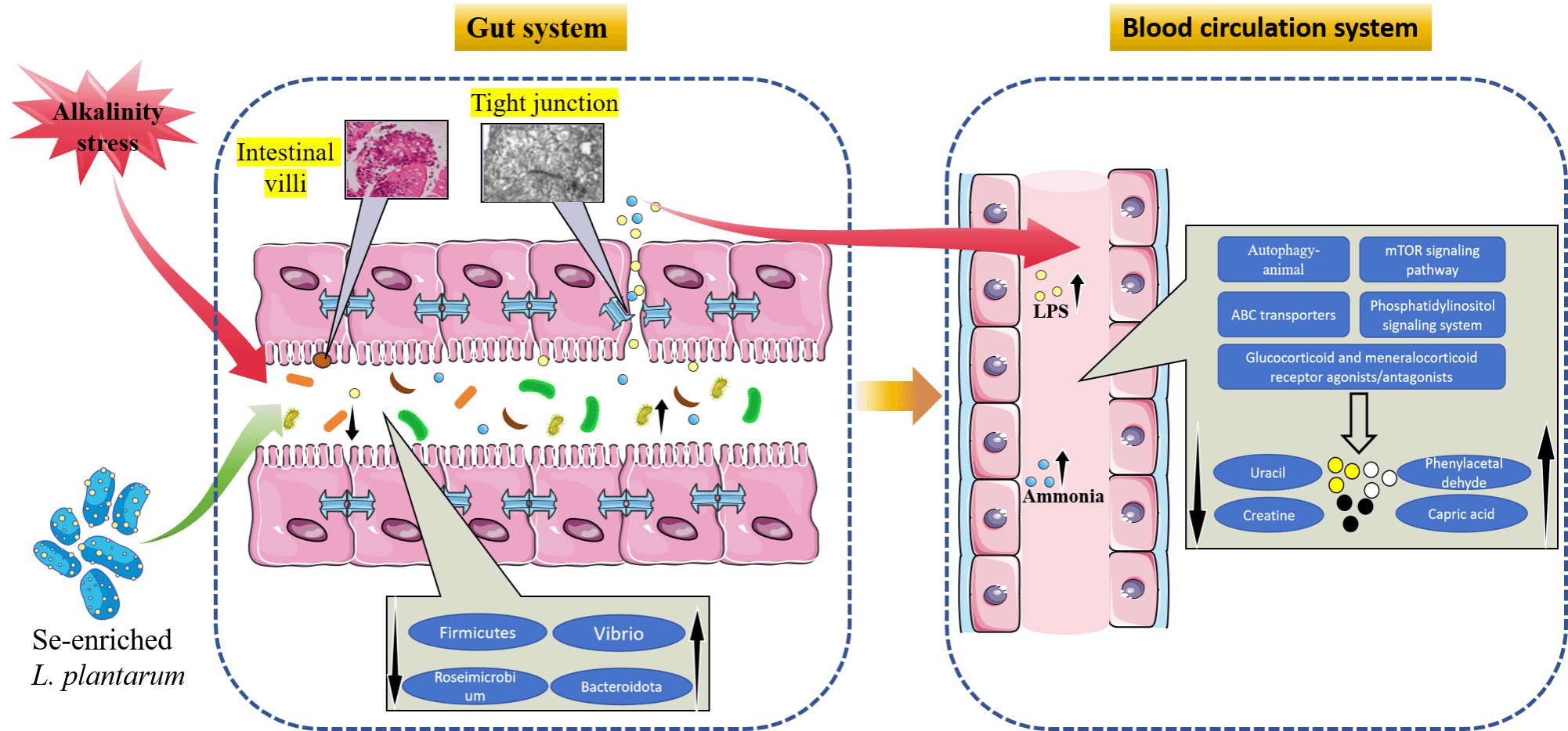为了加大对东北碳酸盐型盐碱水域的开发利用率,8932彩集团盐碱水域养殖品种开发与利用创新团队开展了大量科研工作,通过组织、生理、免疫和多组学等技术研究发现,高碱胁迫下,鲤通过miR-140-5p/ULK2轴调控线粒体自噬触发肝损伤,肝脏中嘧啶代谢产物显著降低(图1),同时肠道的菌群失调会导致高血氨症和内毒素血症。研究表明,在饲料中填加富硒乳酸菌后,会降低高碱诱导弧菌和拟杆菌的丰度,增强ZO-1和Occludin蛋白的表达,调节血液代谢产物肌酸和嘧啶,降低内毒素和血氨含量。富硒乳酸菌通过激活Nrf2和NF-κB信号通路,显著增加SGR、WG和FER,减轻盐度胁迫引起的生长抑制和氧化应激反应(图2)。