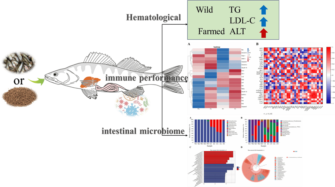 梭鲈(Sander Lucioperca)俗称十道黑、牙鱼,属鲈形目,鲈科,梭鲈属。其体肥肉厚、营养丰富、肉质细嫩、味道鲜美,是优良的养殖品种,具有十分广阔的市场前景。目前梭鲈的人工养殖技术已经突破,从天然饵料转为食用人工饲料,本研究为了解食性的改变对梭鲈肠道免疫功能的影响,从血液、肝脏和肠组织的抗氧化能力、免疫应答、肠道菌群组成等不同层面解析了野生和养殖梭鲈肠肝轴免疫反应和肠道菌群的差异。研究结果表明,野生梭鲈肠组织中谷氨酸丙酮酸转氨酶、谷氨酸草酰乙酸转氨酶活性显著高于养殖梭鲈,野生梭鲈肠道和肝脏组织中p53-BAX/Bcl2信号通路相关基因的表达量均高于养殖梭鲈,养殖梭鲈肠道中鲸杆菌属相对丰度较高。该研究表明,饮食差异会影响梭鲈肠道菌群的组成,肠道菌群的内源性代谢物通过肠肝轴转移,影响宿主的生理功能。通过比较野生和养殖梭鲈个体肠道免疫差异,可以为梭鲈特异性饲料的开发提供依据。