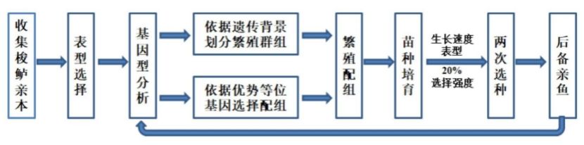 本发明通过收集梭鲈亲鱼群体,分析亲鱼群体的基因型及遗传背景,划分繁殖群组,用生长激素基因中的SSR1和生长激素受体基因中的SSR2标记分析亲鱼群体,筛选出具有优势等位基因的个体,从不同繁殖群组中选择同时具有优势等位基因的雌、雄个体,进行家系或小群体配组繁殖,培育子代,以20%的选择强度进行2次选种作为后备亲鱼等选育方法,在保持群体遗传多样性、避免群体内近亲交配的基础上,达到了快速聚合生长优势等位基因的目的,提高了选育效率和生产性能。