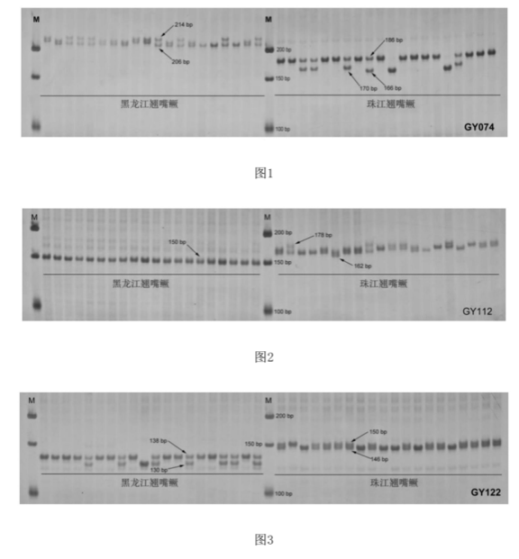 该发明提供了精准区分黑龙江和珠江翘嘴鳜的特异性分子标记(引物对:GY074、GY112和GY122),通过不同基因片段大小,鉴别不同流域的翘嘴鳜种群。综合3个特异标记的扩增结果,对黑龙江与珠江流域样本的检测准确率达到100%。该鉴别方法具有高准确性与重复性,操作简单,检测效率高的技术优势。可在养殖过程中进行抽检,确定鱼种来源,帮助北方养殖制定合理的越冬措施,减少养殖损失,推动了翘嘴鳜产业的健康发展,尤其在北方地区具备广泛应用前景。