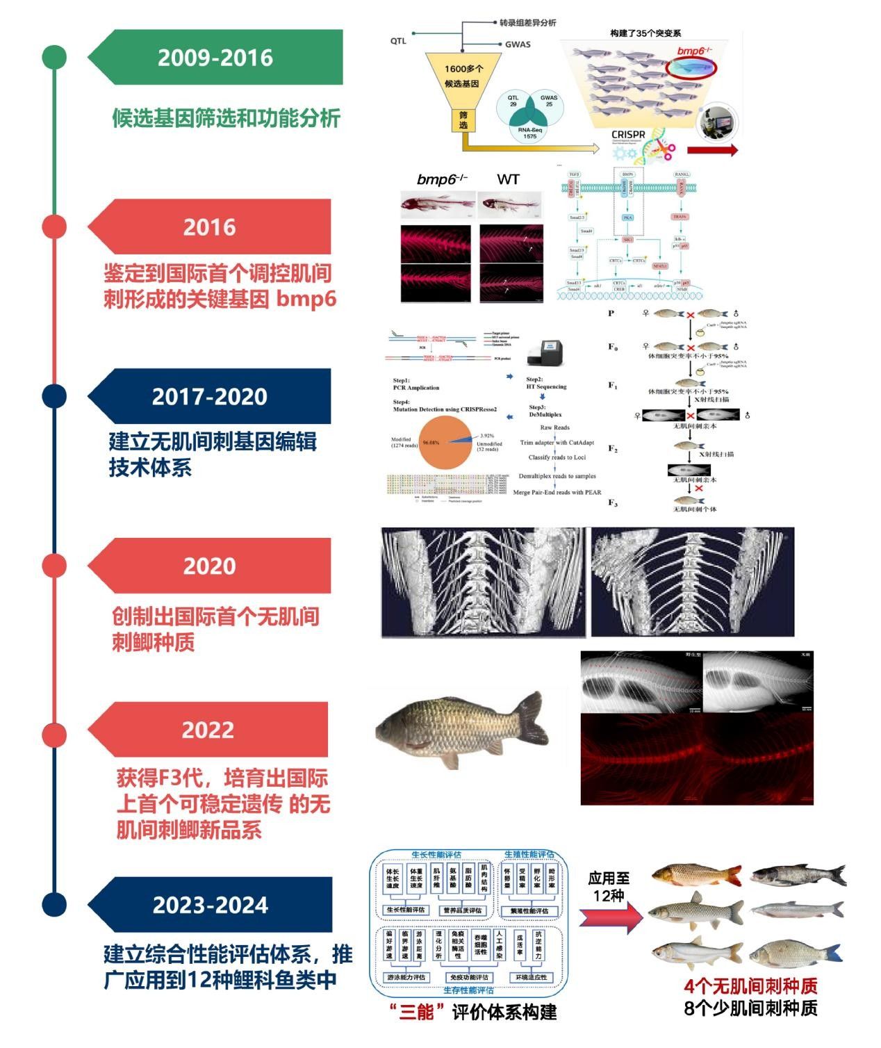 该成果鉴定到国际首个调控肌间刺形成的关键基因bmp6,颠覆肌间刺性状受微效多基因控制的传统认知;建立多基因编辑大片段敲除技术,实现基因编辑敲除检测和纯系构建效率的优化升级,奠定无肌间刺种质创制的技术基础;创建国际首个无肌间刺鲫新品系及生产性能评估方法,技术应用跨越12个种属,证实无肌间刺种质创制技术的普适性和实用性,推动基因编辑新种质产业化进程。