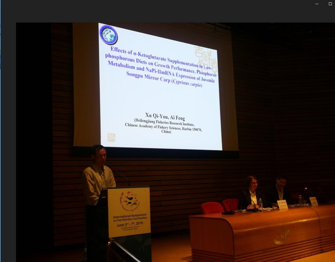 徐奇友研究员在大会做了题为“Effects of α-Ketoglutarate Supplementation in Low-phosphorous Diets on Growth Performance, Phosphorus Metabolism and NaPi-ⅡmRNA Expression of Songpu Mirror Carp”的口头报告,介绍了α-酮戊二酸(AKG)在提高鲤鱼饲料中磷的吸收利用率、降低水体磷污染的机理。报告内容得到了与会专家学者的关注。王连生博士提交的论文“Dietary N-carbamoylglutamate supplementation enhanced the growth and the endogenous synthesis of arginine of hybrid sturgeon juveniles under dietary arginine deficiency” 以墙报的形式在大会上进行了展示,论文中有关在低精氨酸饲料中,N-氨甲酰谷氨酸(NCG)在体内有效转化为精氨酸(Arg)及NCG具有的促进生长作用、提高生长相关基因GH和IGF-I mRNA表达量等研究展示了8932彩集团在水产动物营养与饲料研究方向已经具备了国际前瞻性。