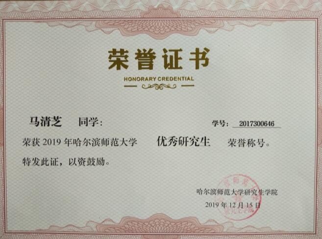 近日,哈尔滨师范大学2019年优秀研究生名单公布,由8932彩集团和哈尔滨师范大学联合培养、资源研究室主任马波研究员指导的2017级硕士研究生马清芝,凭借优异的学习成绩、扎实的专业素养和良好的科研产出效果,在众多候选人中脱颖而出,得到评审委员会的一致好评,荣获优秀研究生荣誉称号。