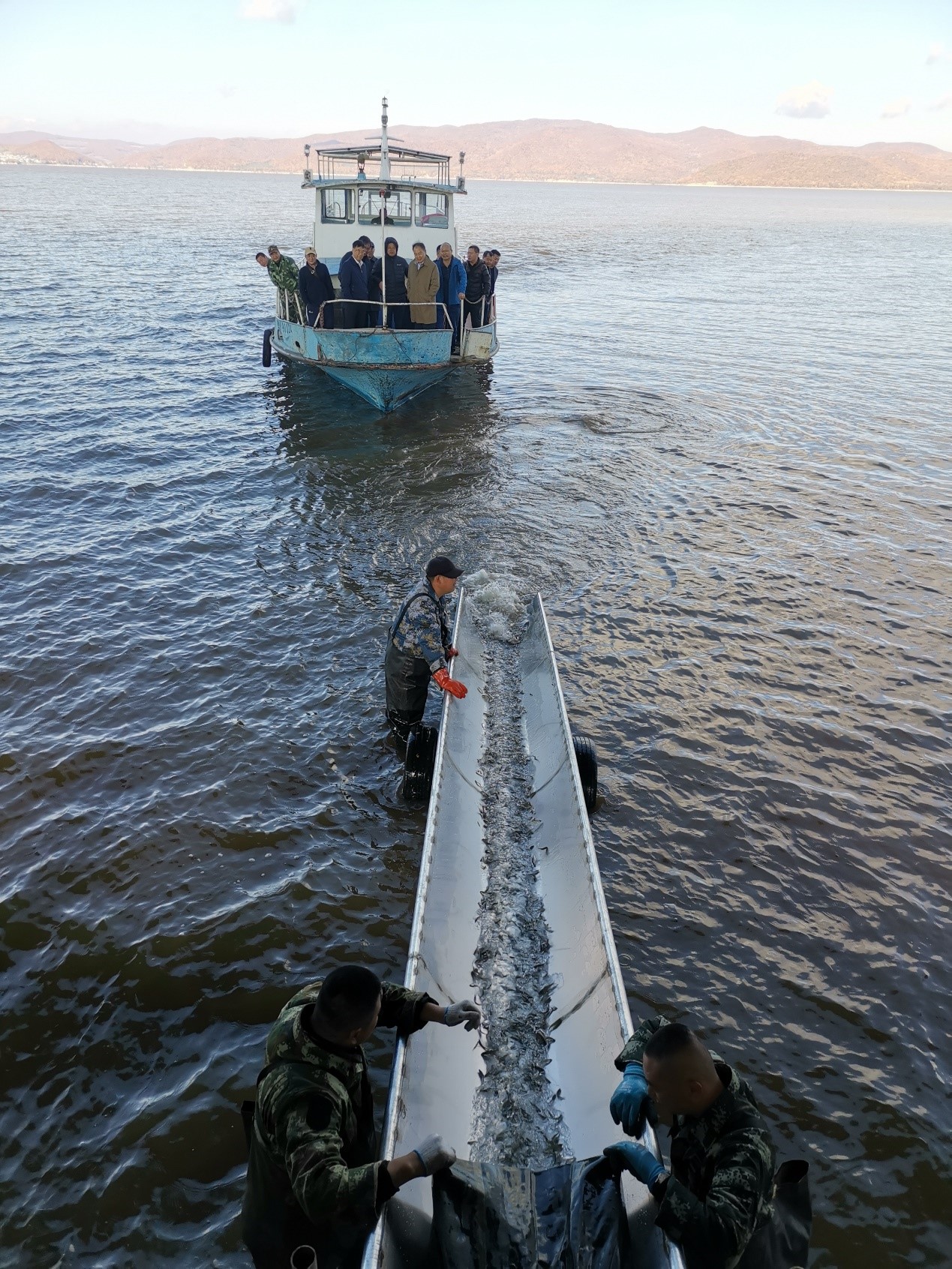 根据2020年《黑龙江省水生生物增殖放流与技术服务》要求及任务安排,10月12日,黑龙江水产研究所在黑龙江省镜泊湖成功放流体长7-12cm蒙古鲌58万尾。这是继2013年首次蒙古鲌增殖放流启动后的第四次放流。黑龙江省渔业渔政局一级调研员张鸿钧、北鱼渔业有限公司董事长刘新路、北鱼渔业有限公司执行总经理康志永、牡丹江市农业农村局副局长李志军、牡丹江市农业农村局渔业科科长高锡亮、副科长孙盛岐、黑龙江省镜泊湖水产养殖场场长刘力、黑龙江水产研究所所长金星、黑龙江水产研究所养殖室主任徐伟,以及相关部门工作人员80余人参加此次放流活动。哈尔滨市呼兰公证处对增殖放流蒙古鲌的规格和数量进行了现场公证。