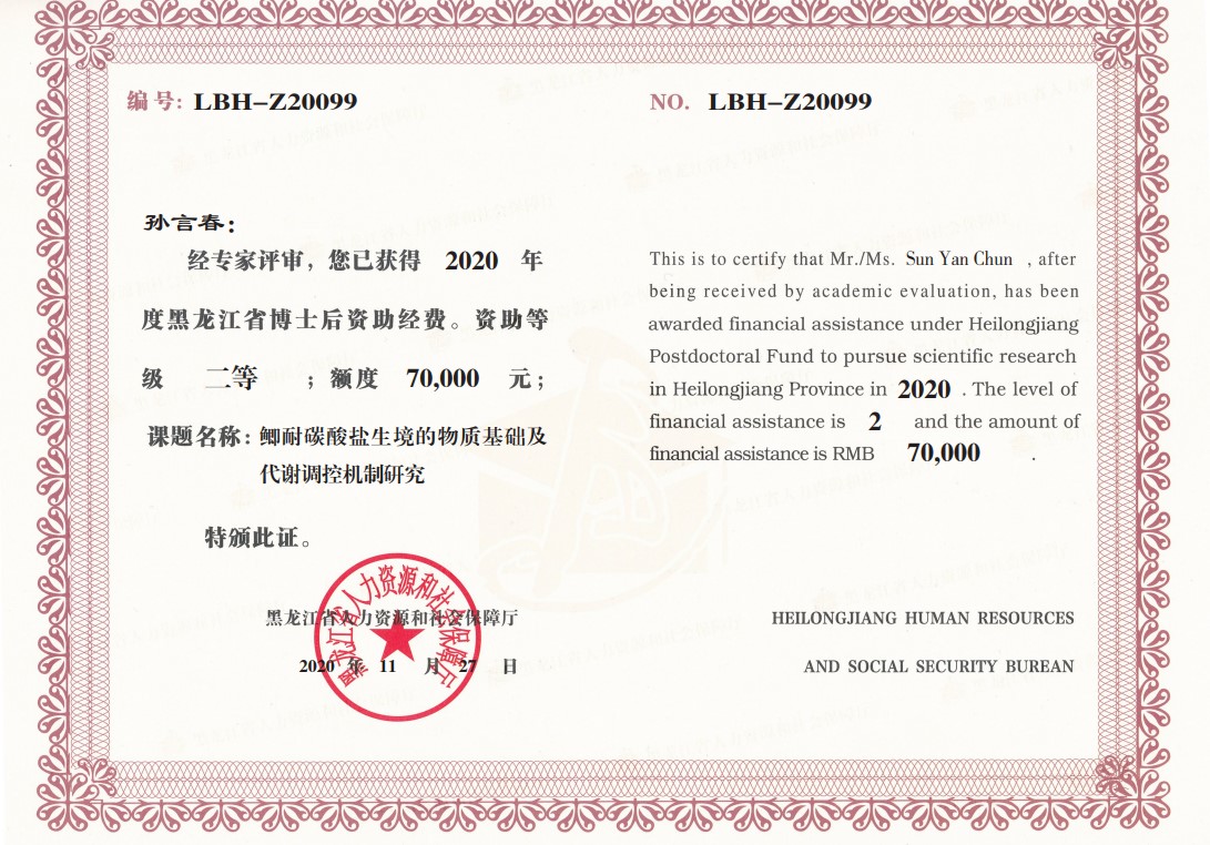 近日,我所博士后工作站基金资助申报工作接连取得新突破,根据《关于公布中国博士后科学基金第68批面上资助获资助人员名单的通知》(中博基字〔2020〕16号)以及《关于公布2020年度黑龙江省博士后专项经费获资助人员名单的通知》(黑人社函〔2020〕382号)文件通知,2020年度我所博士后工作站在站博士后孙言春获国家级面上资助,孙言春、刘洋、张圆圆3人获省级专项资助。