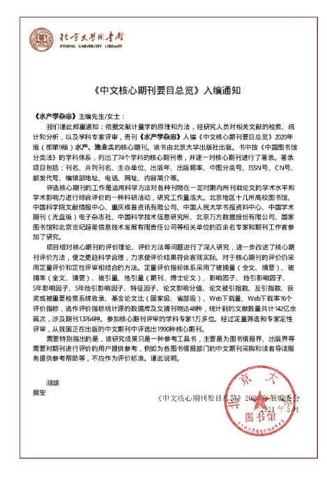 2021年3月8日,北京大学图书馆《中文核心期刊要目总览》致函《水产学杂志》编辑部,依据文献计量学原理和方法,经过对相关文献的检索、统计和分析,及学科专家评审等环节,《水产学杂志》再次入选《中文核心期刊要目总览》2020年版(即第9版)之“水产、渔业”类的核心期刊。这是继2018年之后《水产学杂志》连续第2次入选北大《中文核心期刊要目总览》。