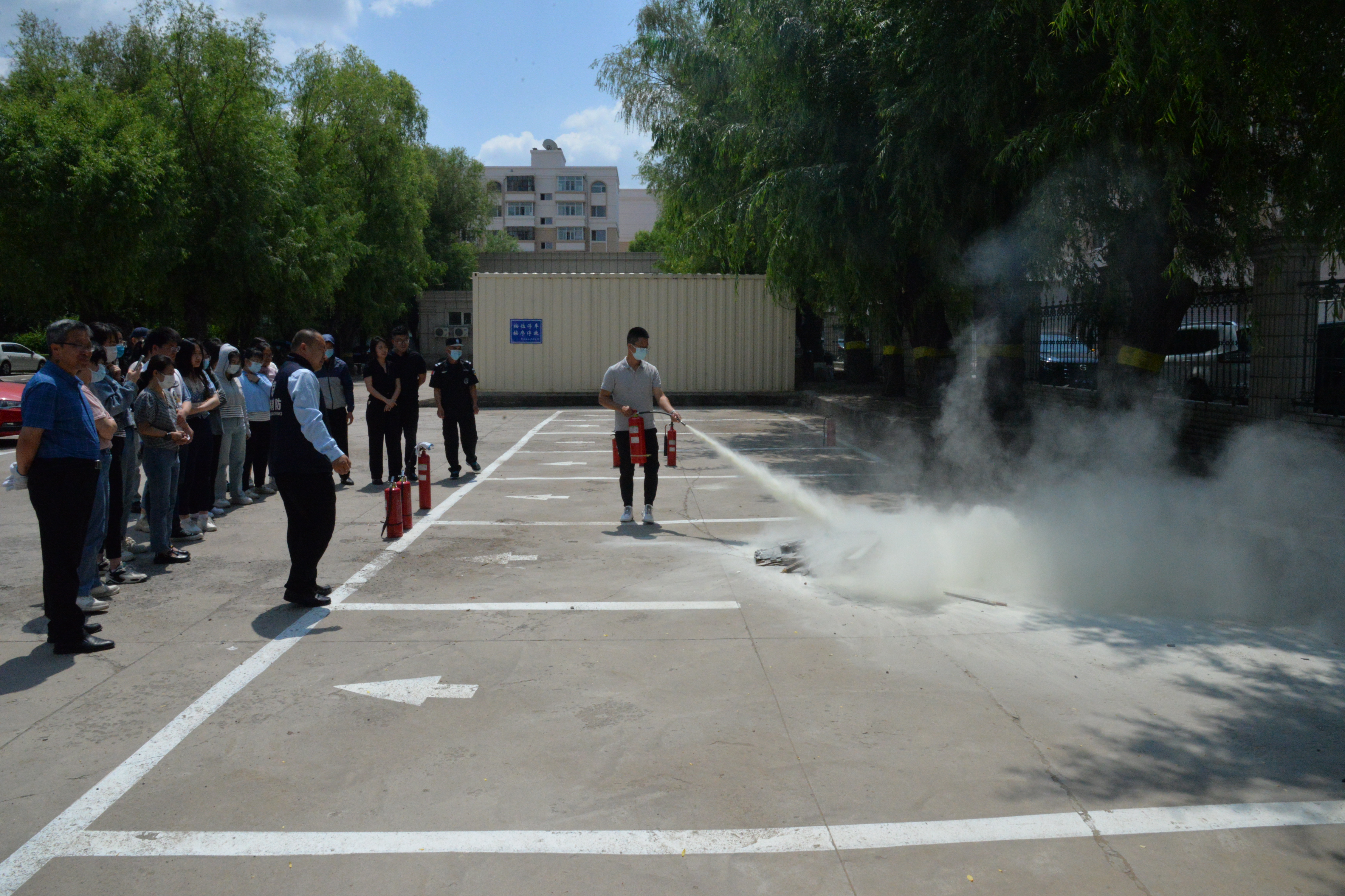 随后,参加培训人员在陈教官的指导下进行了室外干粉、二氧化碳和水基等灭火器使用的实战演练。