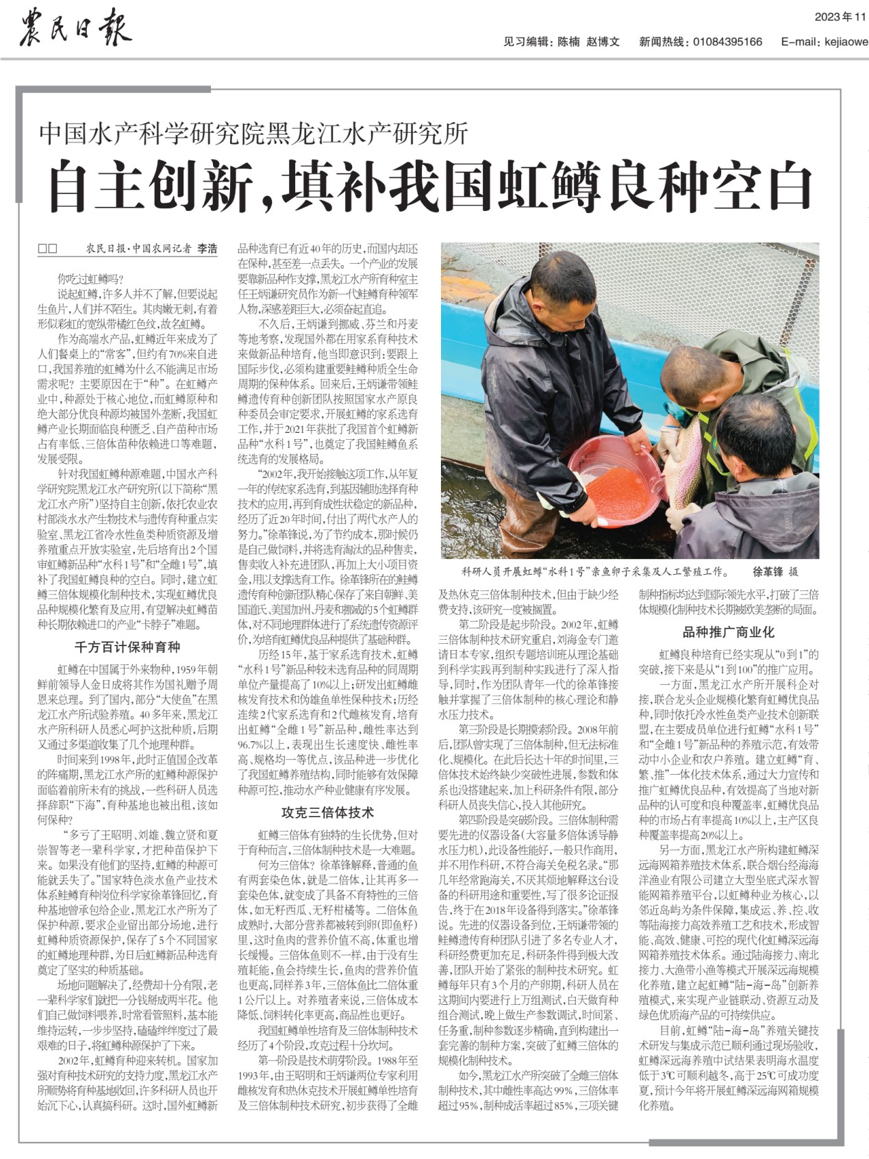 11月7日,《农民日报》以《自主创新,填补我国虹鳟良种空白》为题,详细报道了8932彩集团有关虹鳟种业创新成果。