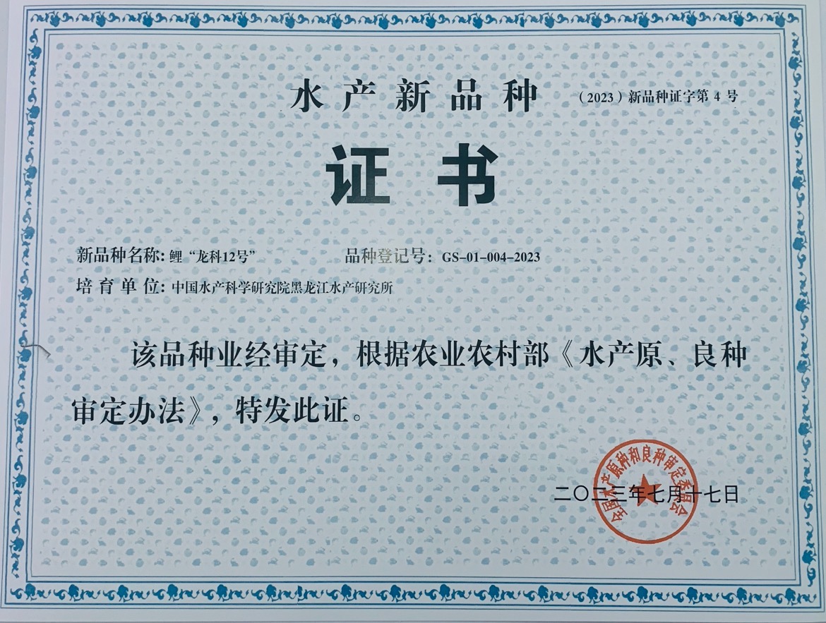 镜鲤“龙科11号”(证书登记号GS-01-001-2022)是采用群体选育与分子辅助选育相结合方法选育出的鲤新品种,较未经选育24月龄德国镜鲤选育系的池塘和网箱养殖成活率分别提高14.8%和31.5%;无鳞个体比例提高23.3 %,占比达60.0%,具抗鲤疱疹病毒病(CyHV-3)、生长速度快、鳞片少的特性。鲤“龙科12号”(证书登记号GS-01-004-2023)是采用群体选育技术,通过人工改良获得的富含多不饱和脂肪酸、口味更鲜美、口感更滑嫩的鲤新品种,2龄肌内脂肪含量8.23%,较黑龙江鲤和松荷鲤,其18月龄肌内脂肪含量高137.18%和65.59%;多不饱和脂肪酸含量高258.36%和275.10%。