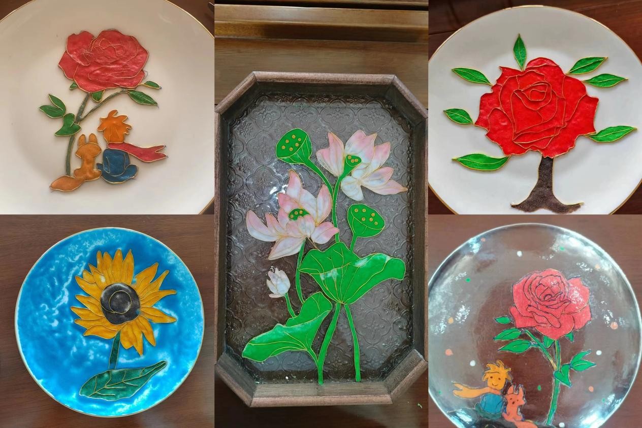活动邀请了专业的掐丝珐琅老师到场,为大家详细解说制作的具体步骤。大家都化身为艺术家,跟着老师的讲解,进行选图、拓印、掐丝、点蓝、定胶……随着制作流程的推进,一朵朵玫瑰、向日葵、芙蓉等跃然盘上,它们或鲜艳、或热烈、或优雅,形象生动,各具特色。
