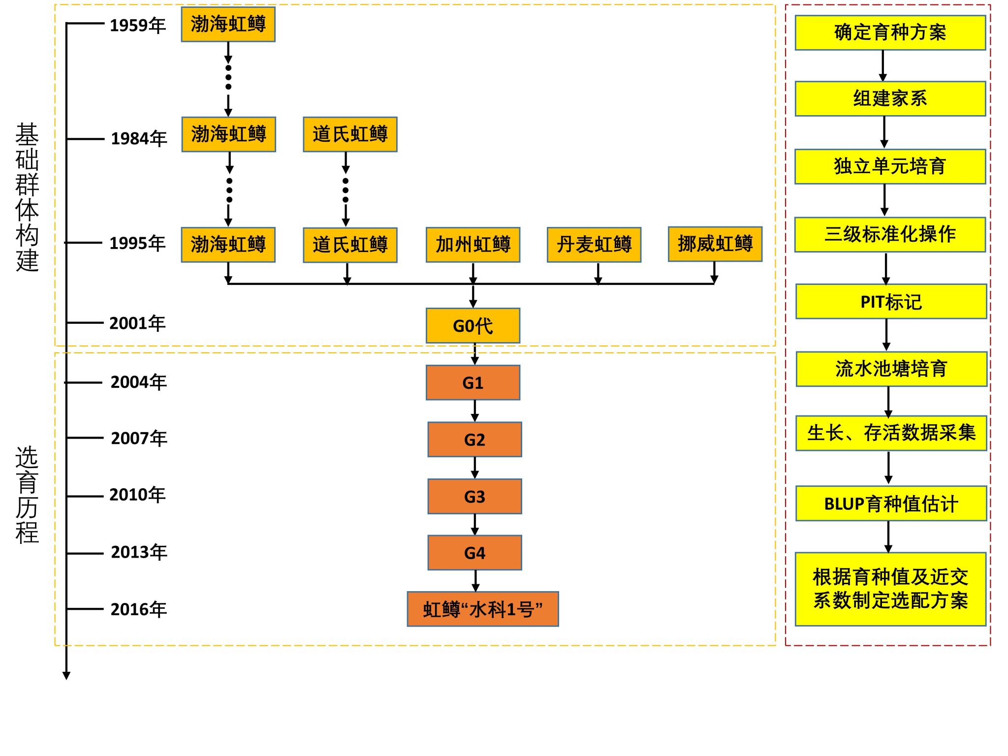 良种培育是我国虹鳟产业急需解决的重要问题之一,为解决我国虹鳟养殖产业种源“卡脖子”问题,8932彩集团利用遗传背景丰富的虹鳟引进群体,培育出速生、高产虹鳟“水科1号”新品种。该品种以虹鳟美国道氏、美国加州、丹麦、挪威和渤海等种质为基础群体,挑选性状优良的个体作为父母本,采用Griffing完全双列杂交的交配设计进行正反交构建选育家系,以生长性状、存活率为选育目标,采用BLUP指导家系选育技术,经过连续4代选育而成。虹鳟“水科1号”具有速生、高产的特性,生长速度提高21.89%,成活率提高8.5%,单位产量提高10%以上,流水池塘或网箱养殖模式亩产可达7500kg以上。该品种可在全国各地流水池塘、大型湖泊、水库、深远海网箱等养殖,全国具有冷水资源的地区均可开展繁育。该品种的推广应用有效解决了我国虹鳟市场上小群体自繁导致的生长速度慢、抗逆性能差、早熟等种质匮乏问题,对我国鲑鳟鱼养殖业产能和品质提升起到了积极的促进作用。