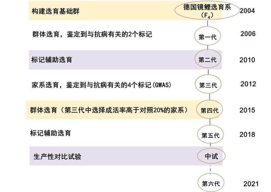 鲤疱疹病毒III型(CyHV-3)是导致鲤养殖中爆发性死亡的主要病原,死亡率可高达90%以上,给鲤产业造成了巨大损失。针对鲤产业中CyHV-3感染导致大规模死亡问题,以解决制约产业关键问题为导向,构建分子精准育种技术体系,突破鱼类抗病性状选育难的技术瓶颈,培育了国内外第一个抗疱疹病毒鲤新品种镜鲤“龙科11号”,解决了因CyHV-3感染发生大规模死亡的鲤产业难题。镜鲤“龙科11号”养殖成活率在93.7%以上,比其它鲤养殖品种成活率提高14.8-600%,且养殖环境越恶劣,其相对成活率越高。镜鲤“龙科11号”抗病新品种的推广养殖,可显著降低鲤养殖CyHV-3感染造成的大规模死亡、提高养殖产量。同时该品种的养殖可减少鱼病的发生,从而减少养殖过程中渔药的使用,提升鱼肉品质,保障水产品质量安全,促进鲤产业的提质增效,适宜在全国范围内的人工可控淡水水体中养殖。