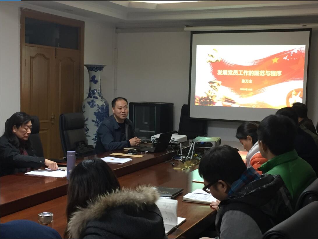 会上,综合处处长张万全为全体支部委员做了题为《发展党员工作的规范与程序》的专题辅导。张万全结合《中国共产党章程》和《中国共产党发展党员工作细则》的有关规定,从“入党积极分子的确定和培训教育”、“发展对象的确定和考察”、“预备党员的接收”和“预备党员的教育、考察和转正”等四个方面对党员发展工作的规范、程序、档案作了详细的讲解,并通过实例明确了支部委员会、党员大会、培养联系人、入党介绍人的职责和任务,梳理出发展党员的25个程序和14项手续及各环节特别注意的问题。