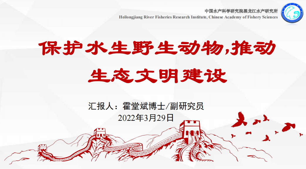 会上,生态环境研究室党支部书记霍堂斌讲授以“保护水生野生动物推动生态文明建设”为主题的党课。此次党课结合了研究生研学活动,意在向大家普及水生野生动物濒危原因和相关保护知识,激发大家学习和研究水生野生动物的兴趣以及参与保护水生野生动物的积极性。