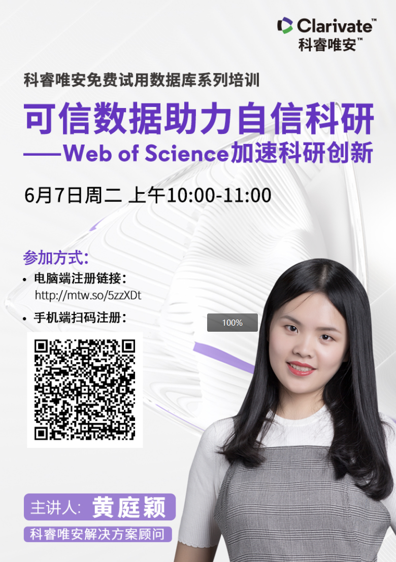 自5月30日科睿唯安开通 Web of Science 核心合集数据库的早期回溯免费试用(5月30日-6月30日)以来,为帮助广大科研人员及师生更好地使用相关数据库开展科研,科睿唯安将于6月7日上午10:00-11:00推出免费试用数据库培训,使新用户在数据库试用过程中能快速上手、便捷使用,并深入了解其在科研发现和管理中更多的应用场景及价值。