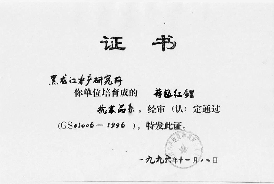 该品种以荷包红鲤和黑龙江鲤杂交,将黑龙江野鲤的抗寒因子转移给杂种,再通过F1自交,从分离的F2中获得一个携带抗寒因子、红色体色、全鳞的荷包红鲤再通过二代强化选育,培育而成,抗寒能力提高到95%以上。生长速度比亲本快10%。主要适合我国北方地区养殖。